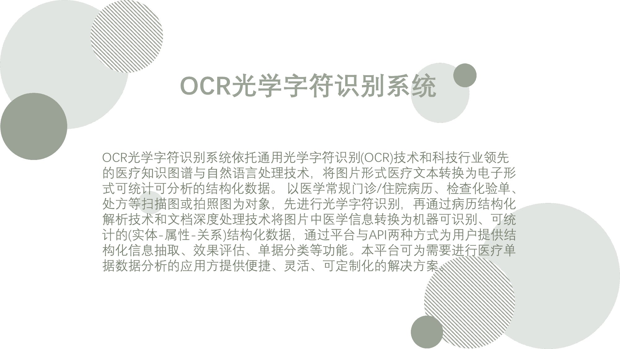OCR文字識別系統(tǒng)依托通用光學字符識別(OCR)技術(shù)和科技行業(yè)領(lǐng)先的醫(yī)療知識圖譜與自然語言處理技術(shù),將圖片形式醫(yī)療文本轉(zhuǎn)換為電子形式可統(tǒng)計可分析的結(jié)構(gòu)化數(shù)據(jù)。